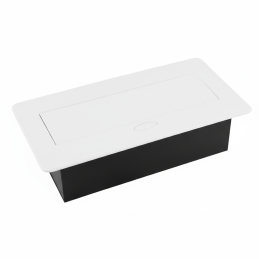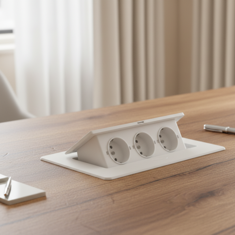 Moderná výklopná vstavaná elektrická zásuvka určená na inštaláciu do pracovného stola alebo nábytku (napr. obývacia stena, kancelársky stôl či kuchynský ostrovček v bezpečnej vzdialenosti od drezu). Vďaka výklopnému mechanizmu je možné zásuvky jednoducho skryť, keď sa nepoužívajú, čím zostáva pracovná plocha čistá a estetická.
