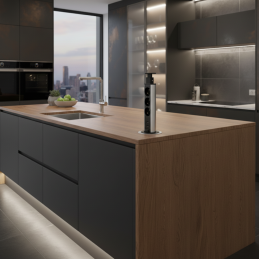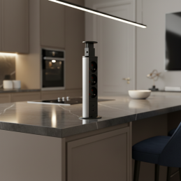 Štýlová výsuvná zásuvka v elegantnom čiernom prevedení je ideálnym riešením pre moderné kuchyne, pracovné stoly či kancelárie. Po zatlačení sa úplne skryje v pracovnej doske, čím šetrí priestor a pôsobí esteticky čistým dojmom. Jednoduchým stlačením sa vysunie a okamžite umožní využívať všetky konektory.